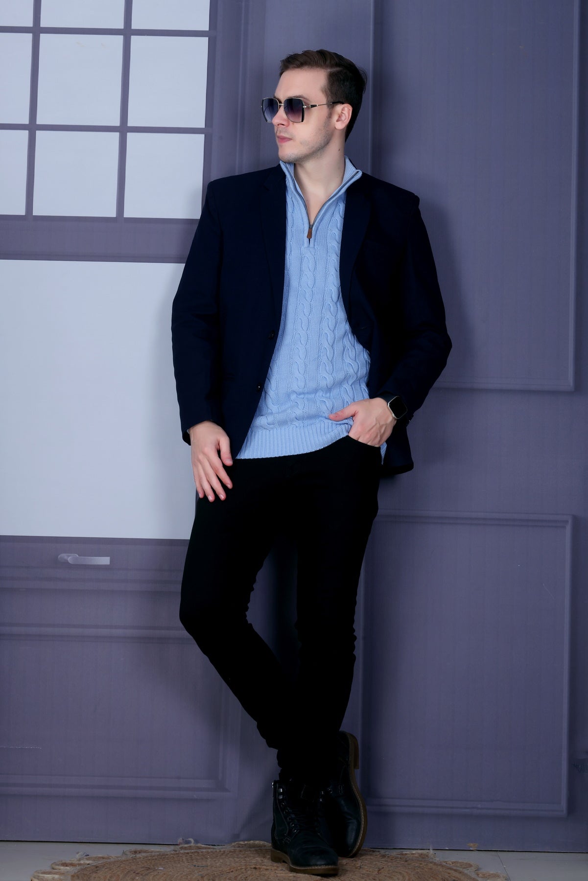Men’s sky blue sweater, collared sweater for men, self-design sweater, men’s winter pullover, sky blue knitwear, stylish men’s sweater, men’s casual winter wear, premium knit pullover, winter fashion for men.