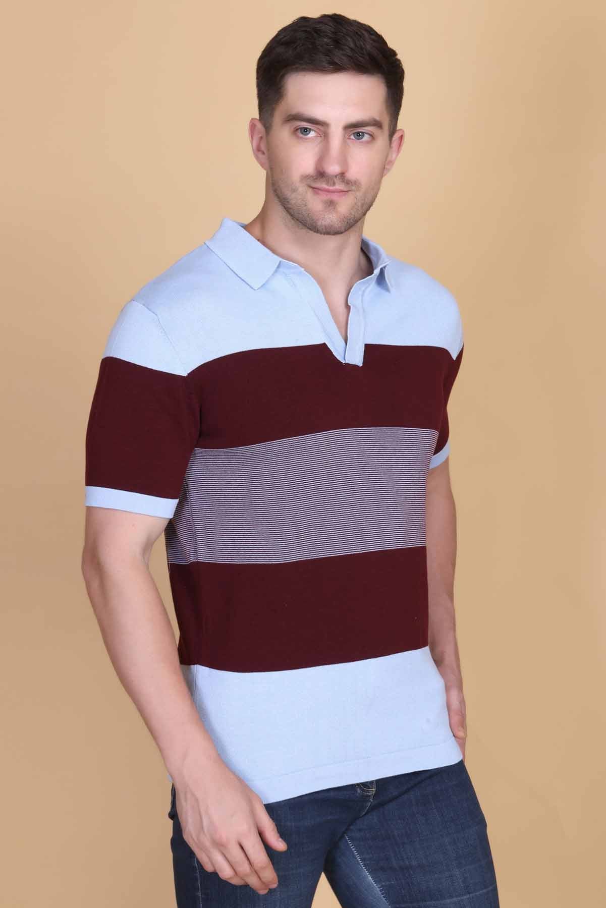 Men’s Sky Blue & Maroon Knit Polo T-Shirt with Striped Pattern