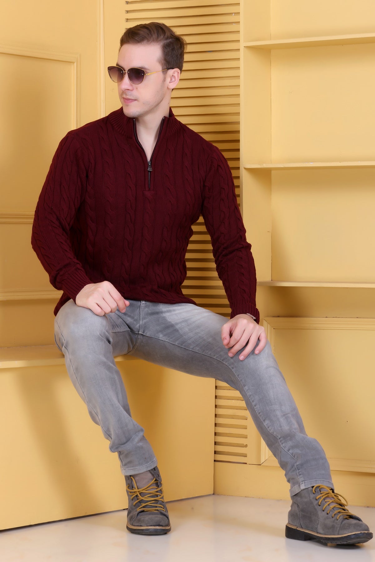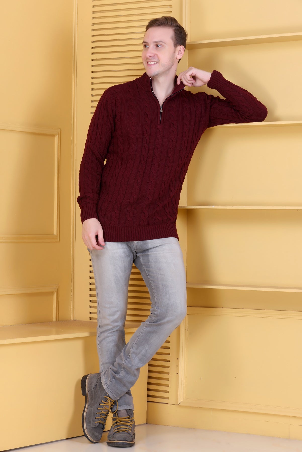 This maroon sweater exemplifies understated luxury for the contemporary man. The self-design pattern provides textural interest without visual clutter, while the collared neckline delivers structural sophistication and styling flexibility. Whether layered beneath blazers for professional environments or worn casually with denim, it adapts seamlessly to your lifestyle. The rich maroon shade offers superior versatility, complementing diverse wardrobes and complexions alike. Constructed with premium materials selected for durability and comfort, this piece resists common wear issues while maintaining its refined appearance season after season. An investment in quality that transcends trends—perfect for those who prioritize enduring style over fleeting fashion statements.