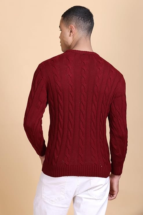 Men’s cable knit sweater, maroon pullover, crew neck sweater, knitted jumper, men’s winter wear, textured knitwear, warm wool blend sweater, classic pullover, men’s fashion sweater, stylish winter outfit.