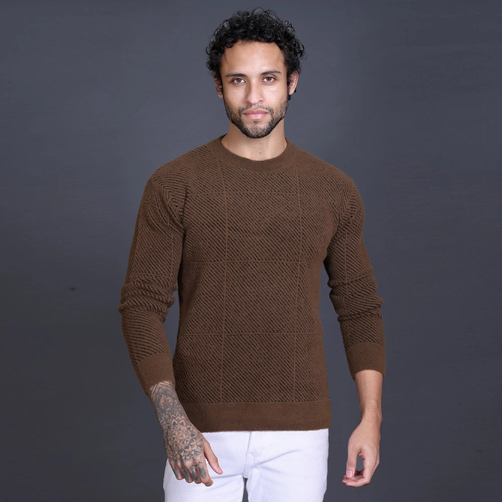 Stay warm in style with this brown knitted woolen sweater for men, featuring a unique geometric textured pattern that adds a modern edge to your winter look. Made from soft and durable woolen knit fabric, it offers excellent warmth and comfort for chilly days. The round neck and full sleeves make it versatile and easy to pair with shirts or jackets. Ideal for casual outings, office wear, or winter travel, this pullover ensures a refined, stylish appearance throughout the season.